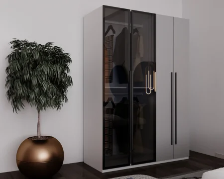 Acest dulap elegant, finisat într-un gri mat , se remarcă prin designul său modern. Dulapul dispune de patru uși: două dintre ele sunt gri, asigurând o notă de simplitate și eleganță, în timp ce celelalte două sunt din sticlă fumurie, oferind un aspect aerisit și permițând vizualizarea conținutului. Manerele de culoare neagra adaugă un accent minimalist completând aspectul piesei.