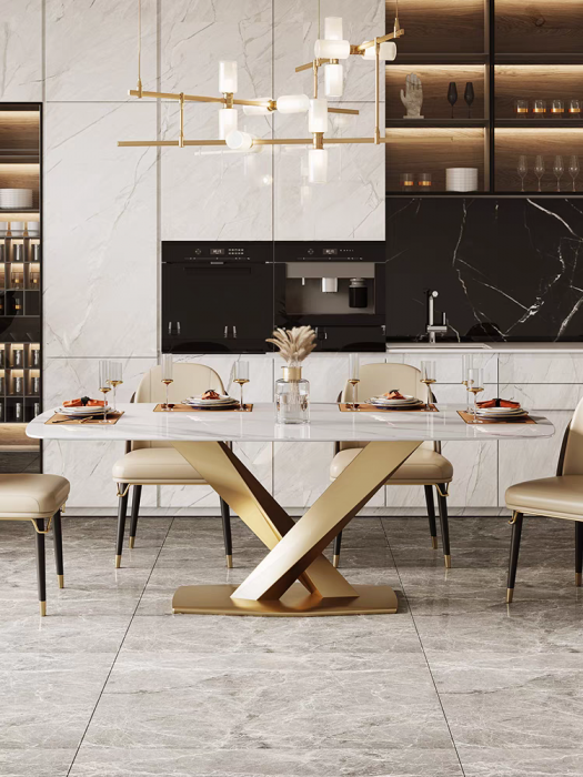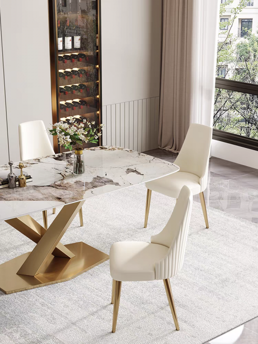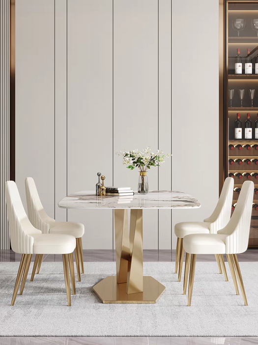 Aceasta masa de dining combina luxul marmurei cu stralucirea piciorului de culoare aurie. Blatul din marmură, cu dimensiunile de 1600x800x750 , oferă o suprafață spațioasă și durabilă, perfectă pentru mesele festive sau întâlnirile cu familia.Aceasta masa este ideala pentru orice sufragerie moderna,fiind o piesa ce aduce un plus de stil si eleganta oricarei sufragerii.