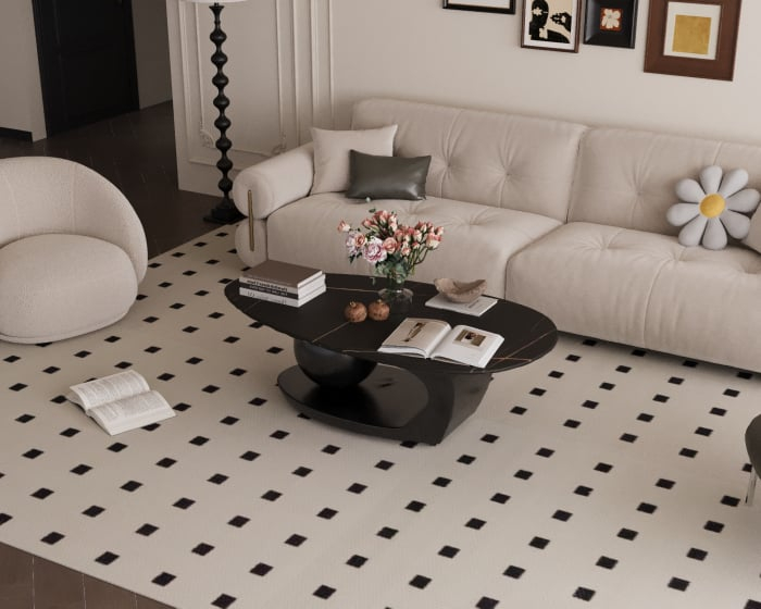 Blat oval din imitație marmură neagră – rafinament și ușurință în întreținere