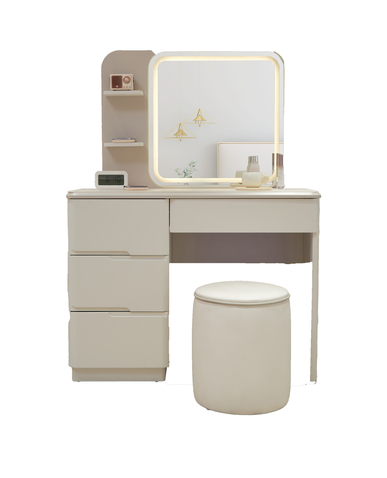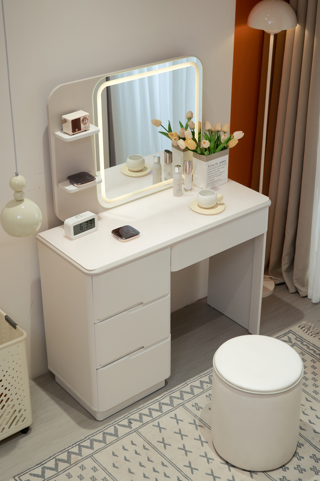 Transformă-ți rutina zilnică de înfrumusețare într-o experiență de răsfăț cu setul de machiaj A18, compus dintr-o masă spațioasă și un scaun confortabil, create pentru a îmbina designul modern cu utilitatea practică.