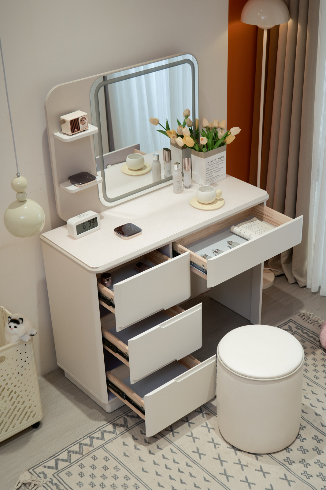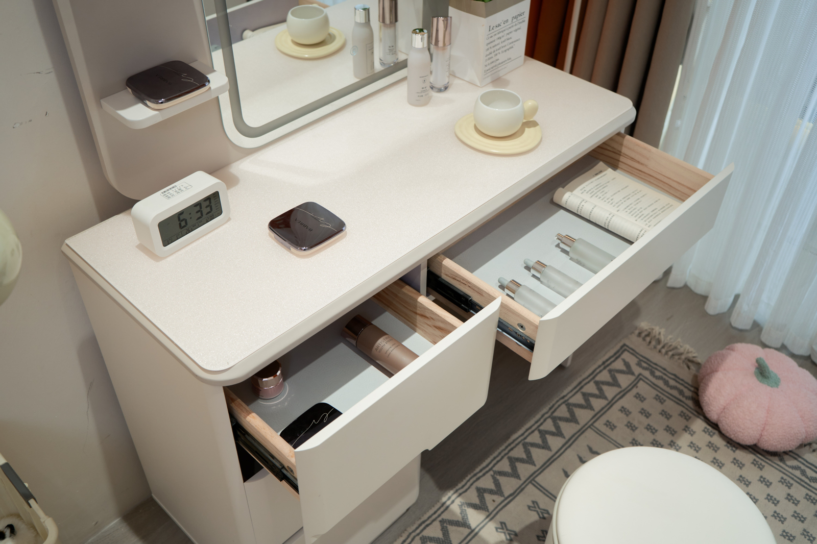 Oglinda integrată, realizată din sticlă securizată, este prevăzută cu iluminare LED integrată, oferind o lumină clară și uniformă — ideală pentru un machiaj precis în orice moment al zilei.