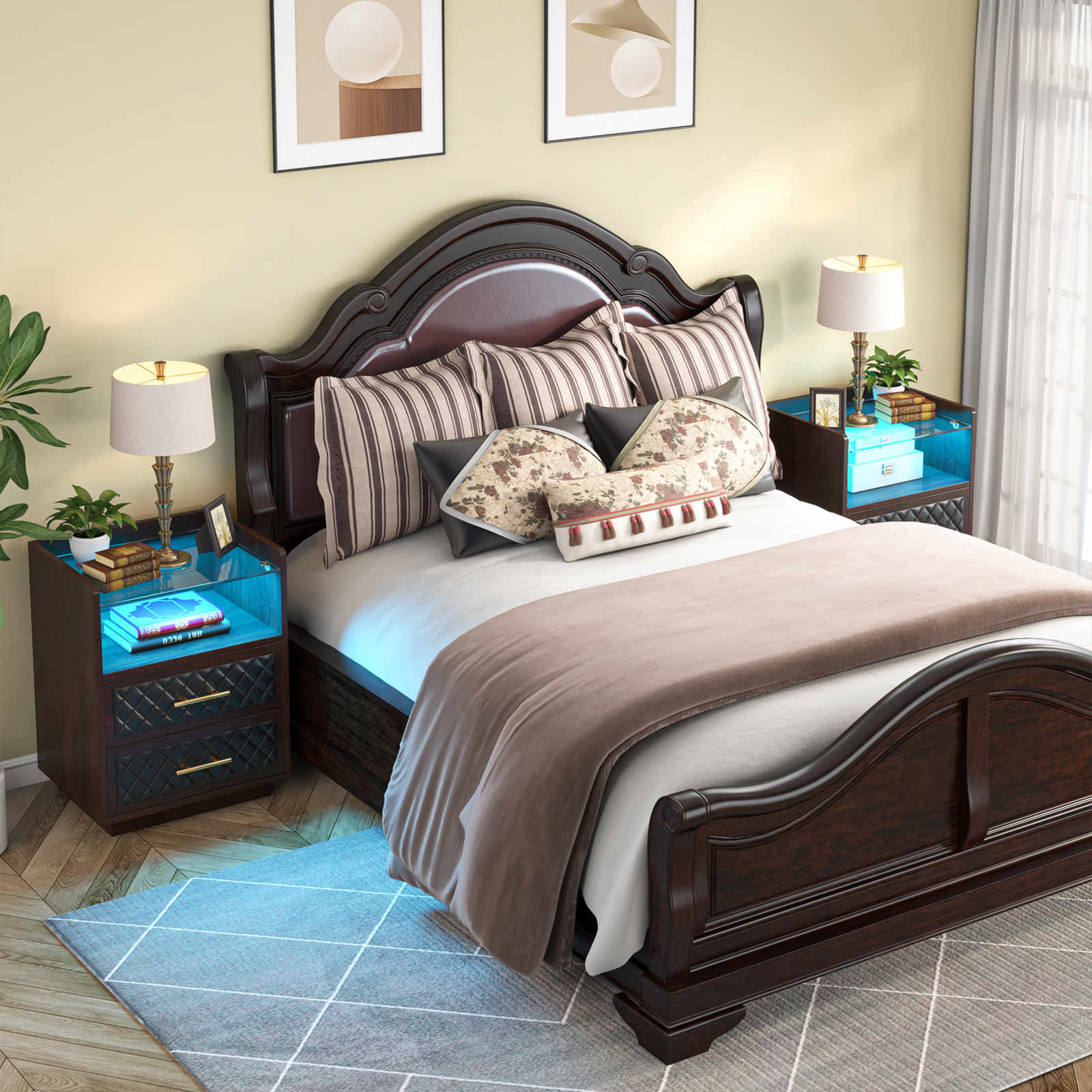 Punctul de atracție este sistemul de iluminare LED RGB, care adaugă un efect vizual spectaculos și o atmosferă unică în dormitorul tău. Poți alege dintr-o gamă variată de culori și moduri de iluminare, perfect adaptabile stării tale de spirit sau stilului camerei.
