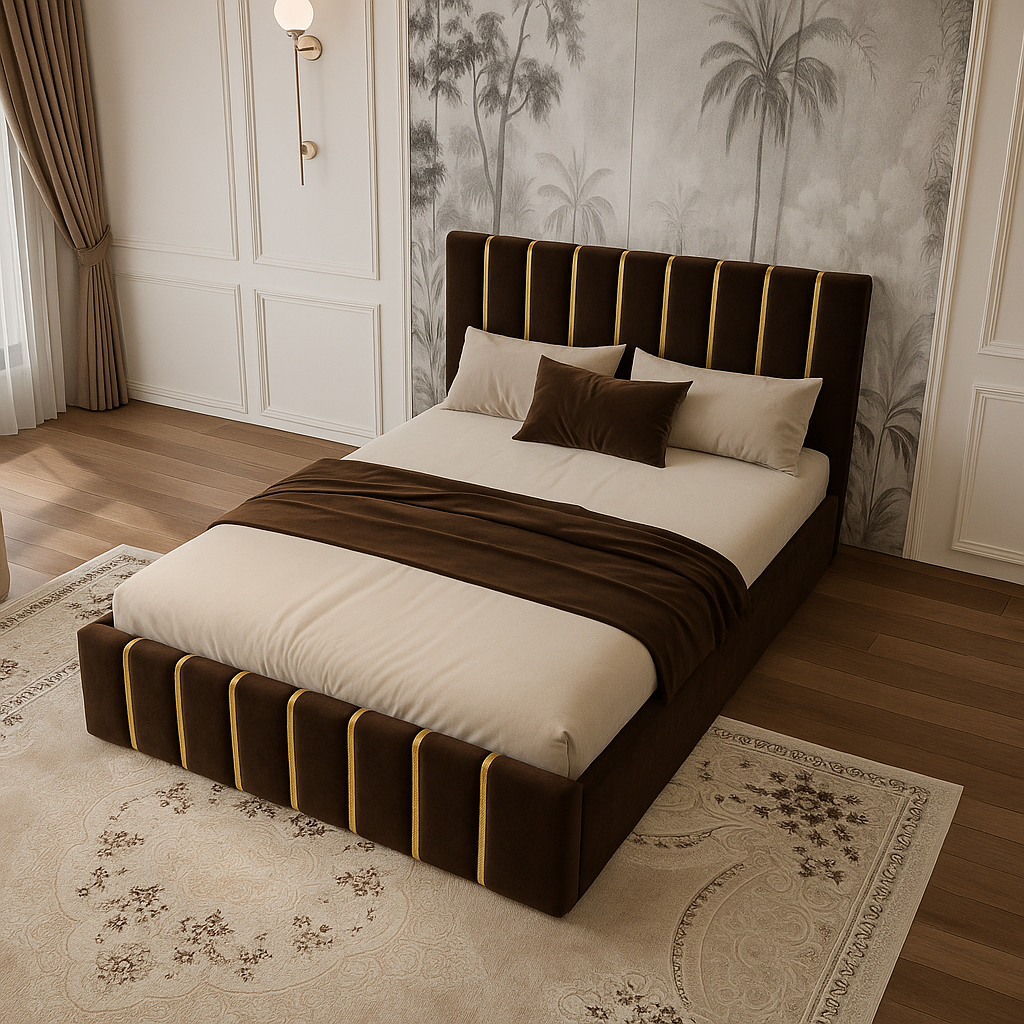 Transformă-ți dormitorul într-un spațiu elegant și rafinat cu acest pat tapițat de 160x200 cm, realizat din catifea (velvet) maro de înaltă calitate. Designul său modern este pus în valoare de accentele aurii premium, care adaugă un plus de stil și lux.